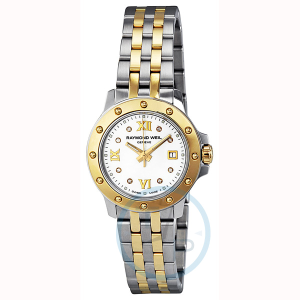 Stainless steel case with a two-tone (silver-tone and 18kt gold-plated) stainless steel bracelet. Fixed 18kt gold-plated bezel. Mother of pearl dial with luminous hands and diamond hour markers. Roman numerals mark the 6, 9 and 12 o'clock positions. Minute markers around the outer rim. Dial Type: Analog. Date display at the 3 o'clock position. Quartz movement. Solid case back. Case diameter: 28 mm. Case thickness: 6.75 mm. Round case shape. Bracelet width: 14 mm. Fold over clasp with a safety release. Water resistant at 30 meters / 100 feet. Functions: date, hour, minute, second. Raymond Weil Tango Diamond Dial Ladies Watch 5399-STP-00995.