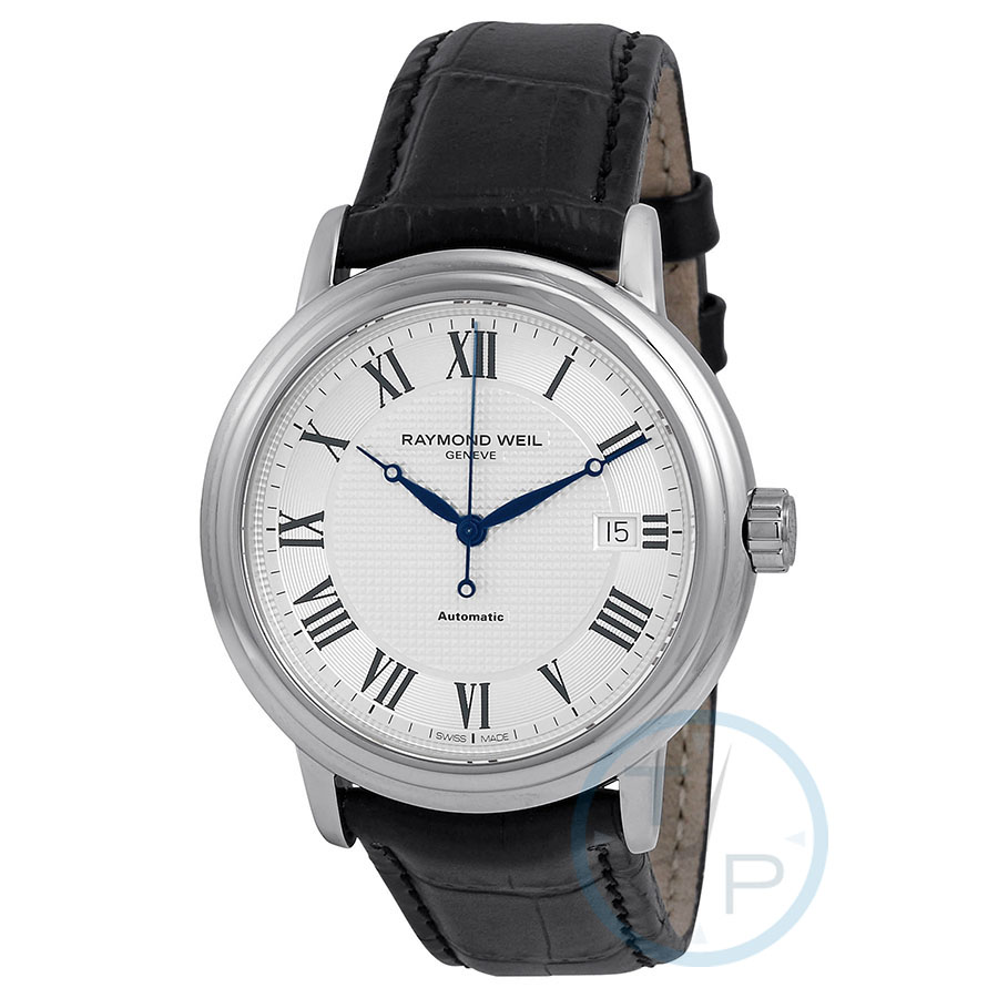 Stainless steel case with a black leather strap. Fixed stainless steel bezel. Silver white dial with blue Breguet-style shape hands and Roman numeral hour markers. Minute markers around the outer rim. Dial Type: Analog. Luminescent hands and markers. Date display at the 3 o'clock position. Raymond Weil calibre RW 4530 automatic movement, containing 26 Jewels, bitting at 28800 vph, and has a power reserve of approximately 38 hours. Scratch resistant sapphire crystal. Pull / push crown. Skeleton case back. Round case shape. Case size: 39.5 mm. Case thickness: 9.5 mm. Band width: 20 mm. Band length: 7.75 inches. Tang clasp. Water resistant at 50 meters / 165 feet. Functions: date, hour, minute, second. Maestro Series. Dress watch style. Watch label: Swiss Made. Item Variations: 2837 STC 00659, 2837.STC.00659, 2837STC00659. Raymond Weil Maestro Automatic Silver Dial Mens Watch 2837-STC-00659.