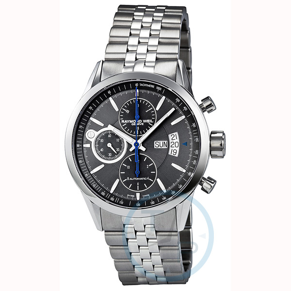 Stainless steel case with a stainless steel bracelet. Fixed stainless steel bezel. Grey dial with silver-tone hands and index hour markers. Minute markers around the outer rim. Dial Type: Analog. Luminescent hands and markers. Day of the week and date display at the 3 o'clock position. Chronograph - three sub-dials displaying: 60 second, 30 minute and 12 hour. Automatic movement. Scratch resistant sapphire crystal. Solid case back. Case diameter: 42 mm. Case thickness: 13.7 mm. Round case shape. Deployment clasp with push button release. Water resistant at 100 meters / 330 feet. Functions: chronograph,day of the week, date, hour, minute, second. Casual watch style. Watch label: Swiss Made. Raymond Weil Grey Dial Stainless Steel Mens Watch 7730-ST-60021.