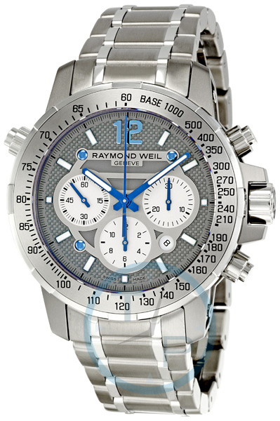 Titanium and stainless steel case and bracelet. Fixed titanium bezel with tachymeters. Dark gray dial with luminous hands and index hour markers. Atabic numeral marks the 12 o'clock position. Minute markers around the outer rim. Luminescent hands and hour markers. Date display between 4 and 5 o'clock position. Chronograph - three sub-dials displaying: 60 seconds, 30 minutes and 12 hours. Automatic movement. Scratch resistant sapphire crystal. Screw down crown. Solid case back. Case diameter: 46 mm. Case thickness: 15 mm. Deployment clasp. Water resistant at 200 meters / 660 feet. Functions: chronograph, tachometer, date, hour, minute, second. Raymond Weil Nabucco Mens Watch 7800-TI-05607.