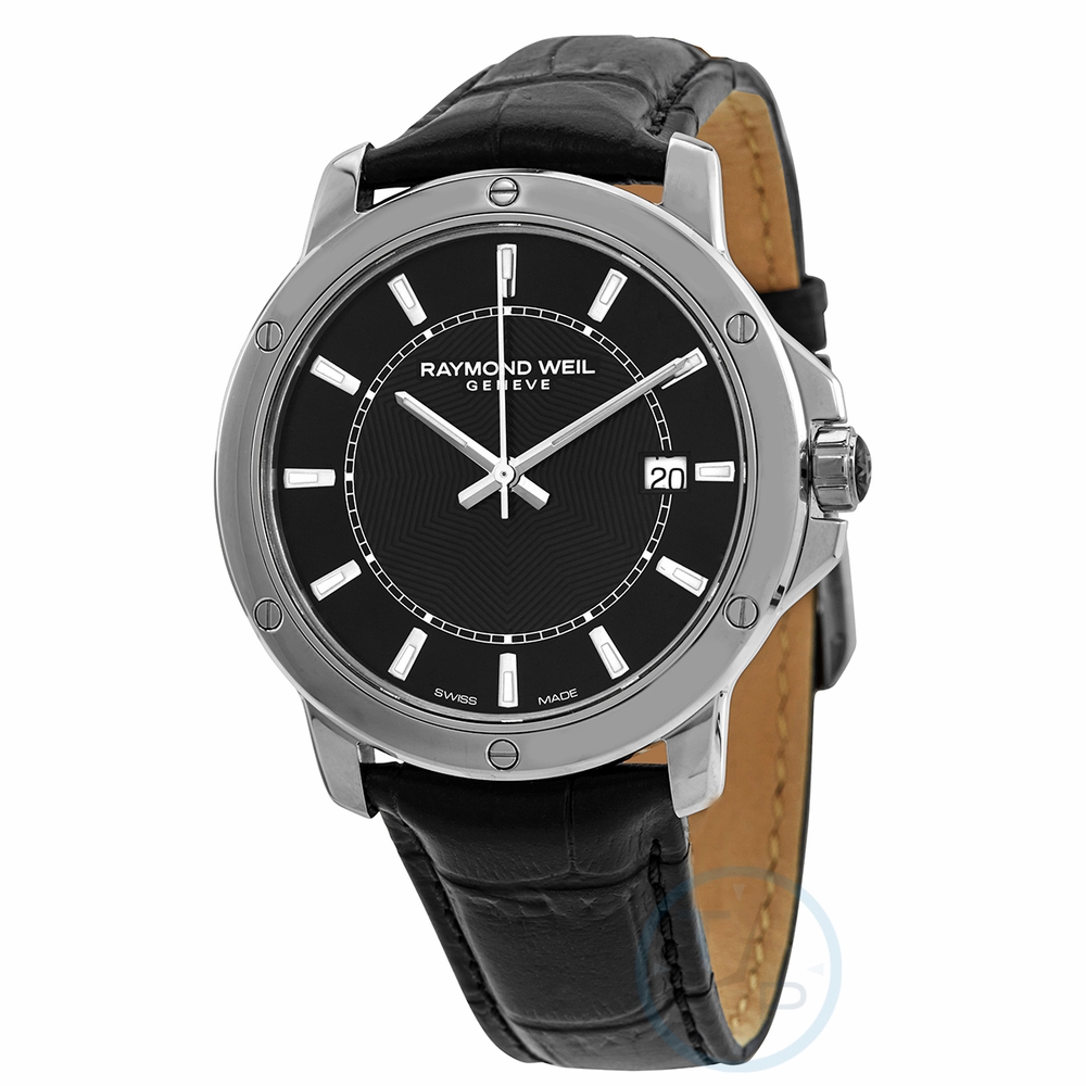 Silver-tone stainless steel case and bracelet. Fixed bezel. Black dial with silver-tone hands and index hour markers. Dial Type: Analog. Luminescent hands and markers. Date display at the 3 o'clock position. Quartz movement. Scratch resistant sapphire crystal. Pull / push crown. Solid case back. Round case shape, case size: 39 mm. Water resistant at 100 meters / 330 feet. Functions: date, hour, minute, second. Tango Series. Dress watch style. Watch label: Swiss Made. Raymond Weil Tango Quartz Black Dial Mens Watch 5591-STC-20001.