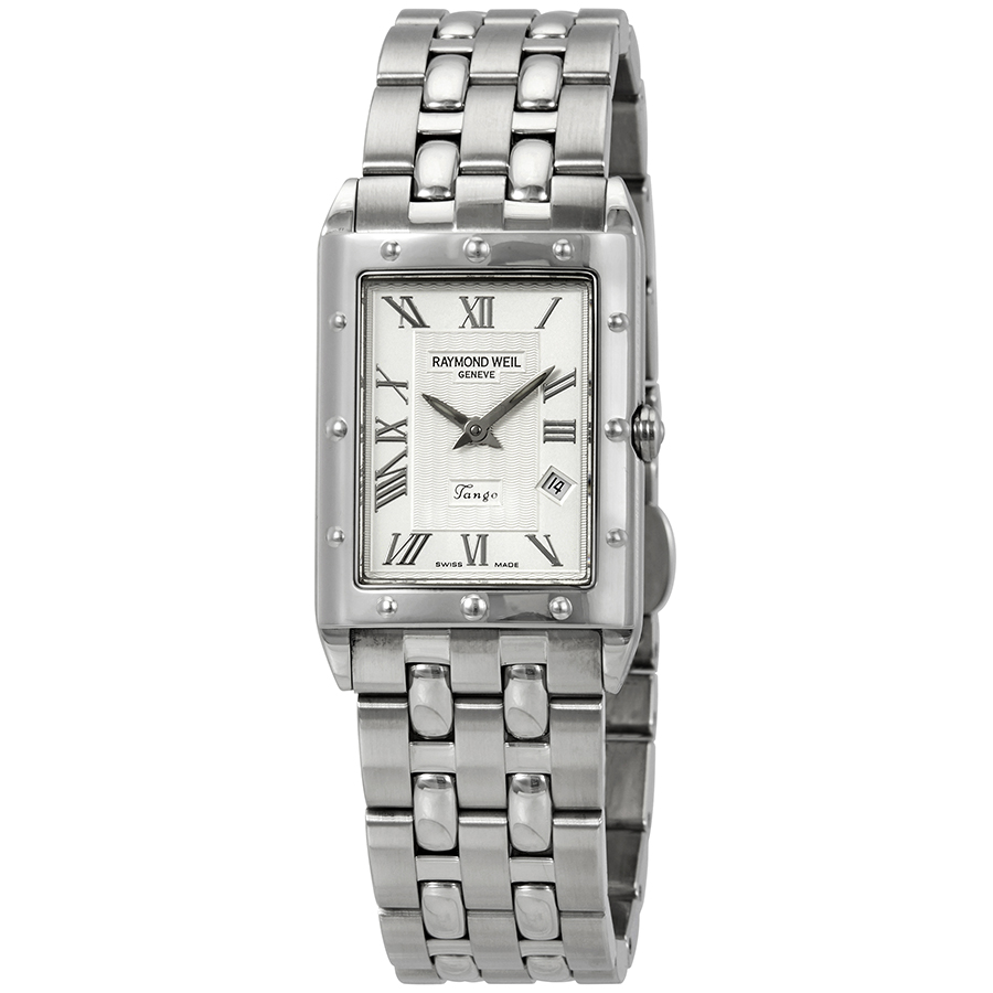 Silver-tone stainless steel case with a silver-tone stainless steel bracelet. Fixed stainless steel bezel. Silver dial with silver-tone hands and Roman numeral hour markers. Dial Type: Analog. Date display at the 4 o'clock position. Quartz movement. Scratch resistant sapphire crystal. Solid case back. Rectangle case shape. Deployment with push button release clasp. Functions: date, hour, minute, second. Dress watch style. Watch label: Swiss Made. Item Variations: 5981 ST 00659, 5981.ST.00659, 5981ST00659. Raymond Weil Tango Silver Dial Watch 5981-ST-00659.
