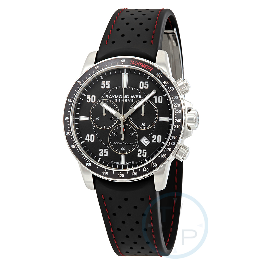 Stainless steel case with a black rubber strap. Fixed stainless steel bezel with a black aluminium top ring showing tachymeter markings. Black dial with luminous silver-tone hands. Arabic numeral minute markers (at 5 minute intervals). Minute markers around the outer rim. Dial Type: Analog. Luminescent hands and markers. Date display between the 4 and 5 o'clock positions. Chronograph - three sub-dials displaying: 60 second, 30 minute and 12 hours. Quartz movement. Scratch resistant sapphire crystal. Screw down crown. Solid case back. Round case shape. Case size: 43 mm. Case thickness: 11.9 mm. Band width: 20 mm. Push button clasp. Water resistant at 300 meters / 1000 feet. Functions: chronograph, tachymeter, date, hour, minute, second. Dive watch style. Watch label: Swiss Made. Raymond Weil Tango Chronograph Black Dial Mens Watch 8570-SR1-05207.