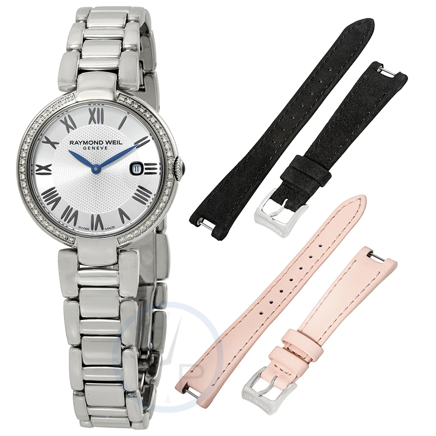 Silver-tone stainless steel case with a pink leather strap. Fixed silver-tone stainless steel set with diamonds bezel. Silver dial with blue hands and Roman numeral hour markers. Dial Type: Analog. Date display at the 3 o'clock position. Quartz movement. Scratch resistant sapphire crystal. Pull / push crown. Solid case back. Round case shape, case size: 32 mm, case thickness: 8.6 mm. Band width: 16 mm. Fold over clasp with a push button release. Water resistant at 50 meters / 165 feet. Functions: date, hour, minute. Shine Etoile Series. Dress watch style. Watch label: Swiss Made. Raymond Weil Shine Etoile Dial Ladies Diamond Watch 1600-STS-RE659.