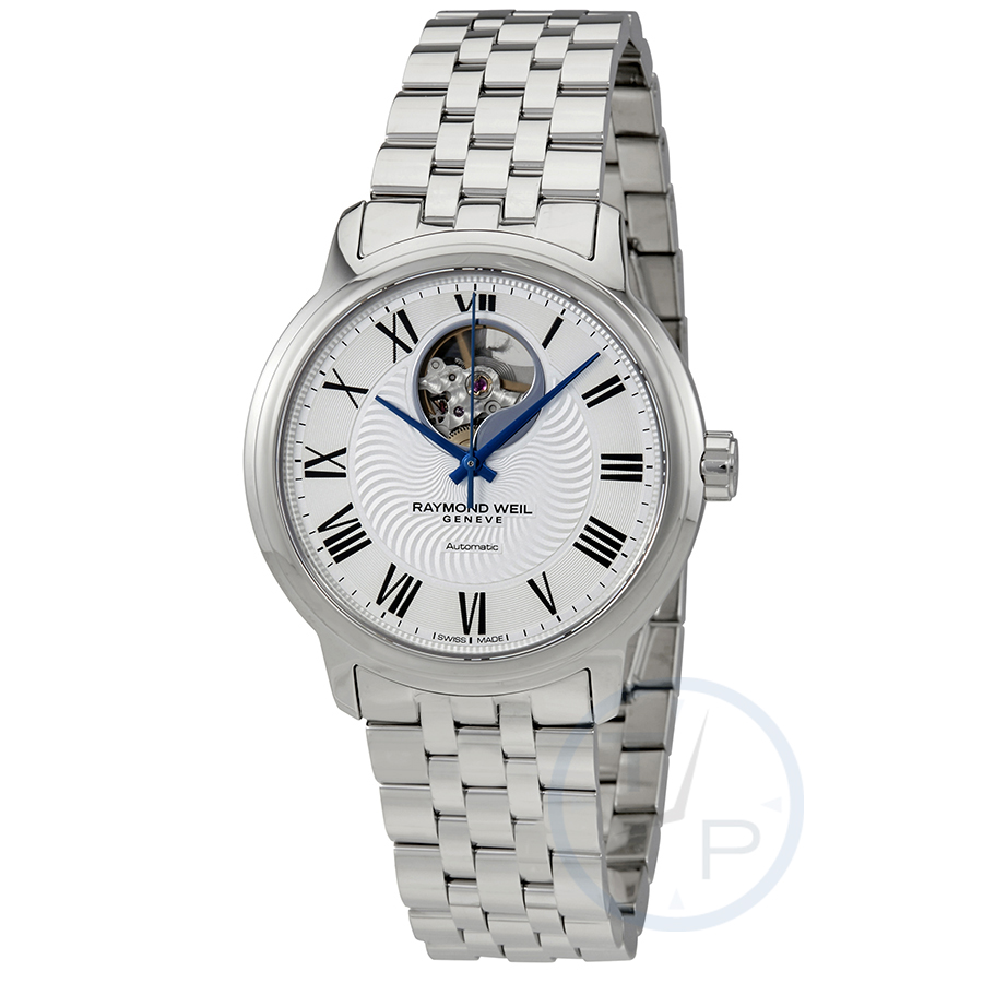 Stainless steel case with a stainless steel bracelet. Fixed stainless steel bezel. Silver (open display) dial with blue hands and Roman numeral hour markers. Minute markers around the outer rim. Dial Type: Analog. Automatic movement with about 38 hours of power reserve. Scratch resistant sapphire crystal. Pull / push crown. Transparent case back. Case size: 39.5 mm. Case thickness: 9.2 mm. Round case shape. Band width: 20 mm. Deployment clasp. Water resistant at 50 meters / 165 feet. Functions: hour, minute, second. Luxury watch style. Watch label: Swiss Made. Raymond Weil Maestro Automatic Silver Dial Mens Watch 2227-ST-00659.