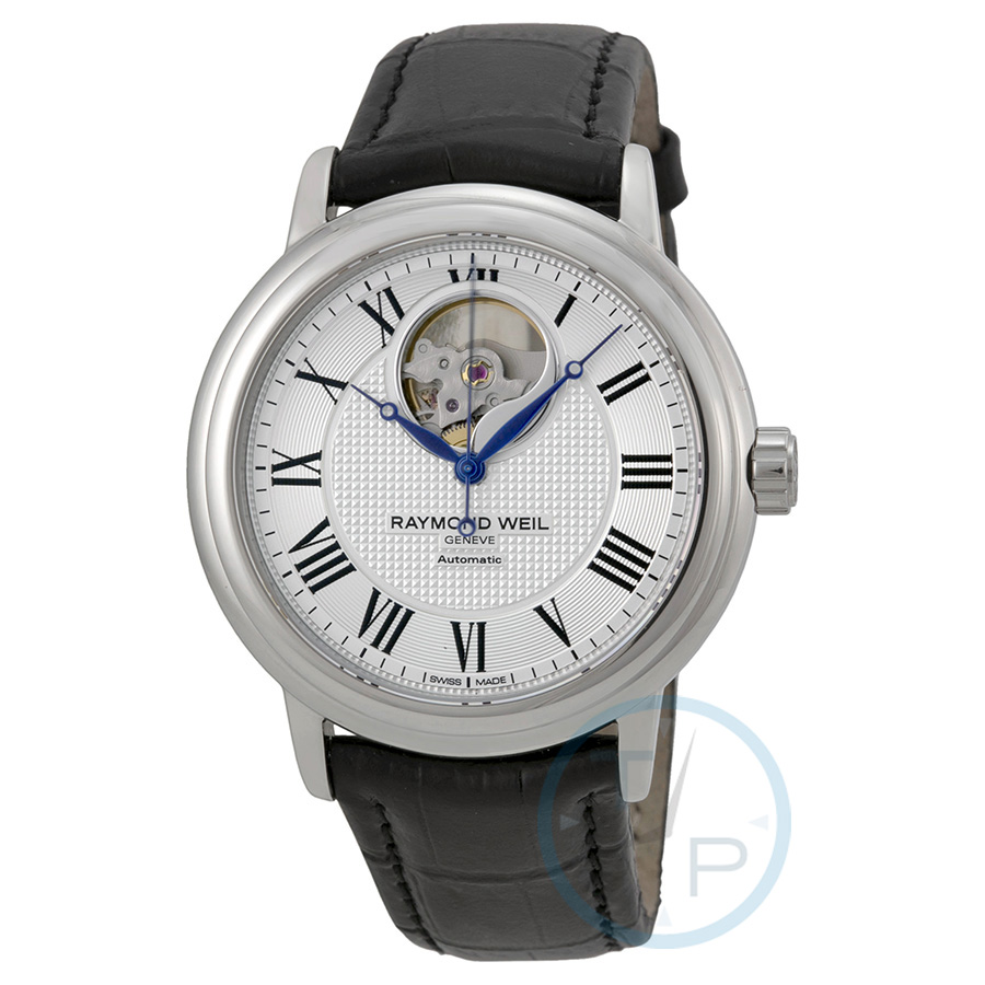 Stainless steel case with a black (calfskin) leather strap. Fixed stainless steel bezel. Silver dial (with an open balance wheel display) dial with blue hands and Roman numeral hour markers. Minute markers around the outer rim. Dial Type: Analog. Luminescent hands and markers. Raymond Weil calibre RW4200 automatic movement with a 38-hour power reserve. Scratch resistant sapphire crystal. Pull / push crown. Skeleton case back. Case size: 40 mm. Case thickness: 11 mm. Round case shape. Band width: 20 mm. Tang clasp. Water resistant at 50 meters / 165 feet. Functions: hour, minute, second. Casual watch style. Watch label: Swiss Made. Item Variations: 2827 STC 00659, 2827.STC.00659, 2827STC00659. Raymond Weil Maestro Silver Dial Mens Watch 2827-STC-00659.