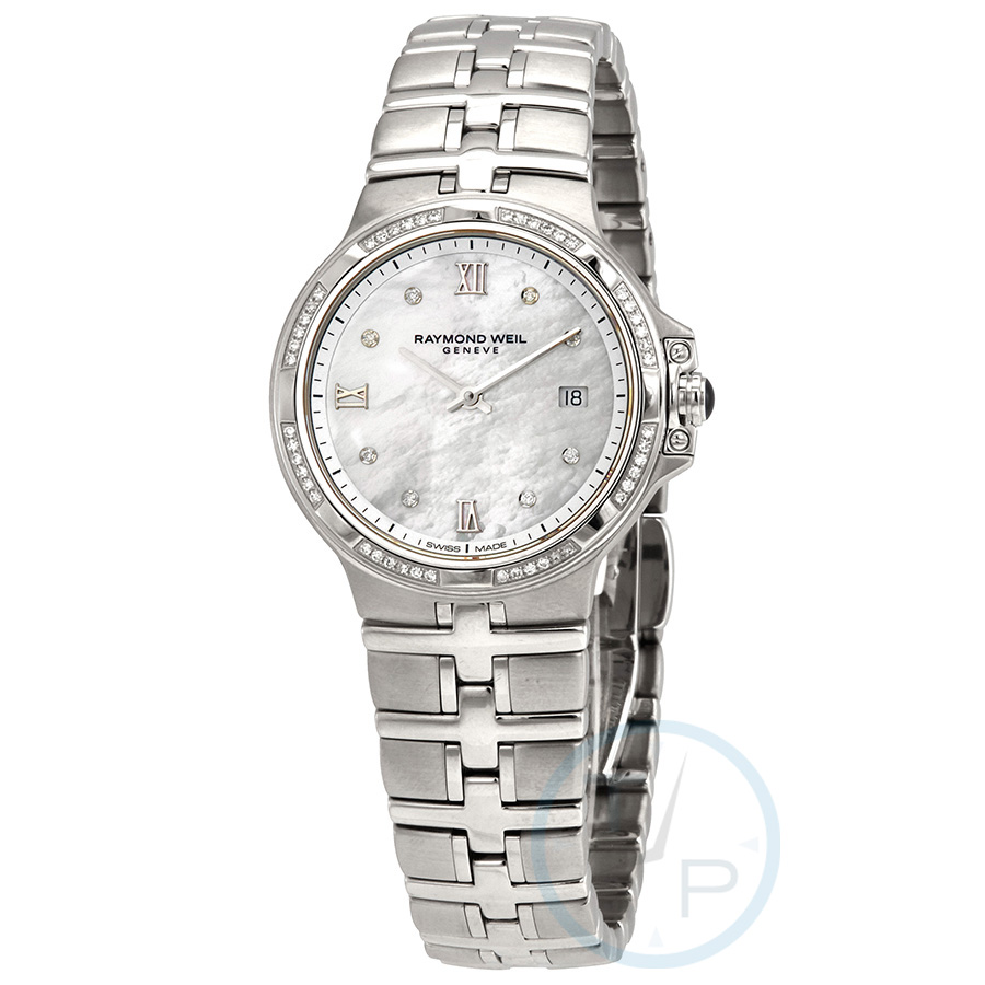 Stainless steel case with a stainless steel bracelet. Fixed stainless steel bezel set with diamonds. White mother of pearl dial with silver-tone hands and diamond hour markers. Roman numerals mark the 6, 9 and 12 o'clock positions. Minute markers around the outer rim. Dial Type: Analog. Date display at the 3 o'clock position. Quartz movement. Scratch resistant sapphire crystal. Pull / push crown. Solid case back. Round case shape. Case size: 30 mm. Case thickness: 5.9 mm. Fold over clasp with a double safety release. Water resistant at 50 meters / 165 feet. Functions: date, hour, minute, second. Additional Info: 48 diamonds on case & dial / 0.13 ct. Dress watch style. Watch label: Swiss Made. Raymond Weil Parsifal Diamond White Mother of Pearl Dial Ladies Watch 5180-STS-00995.