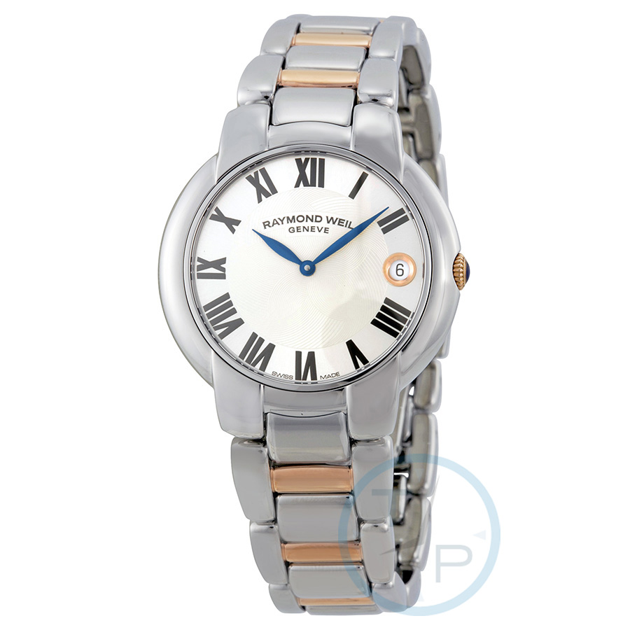 Stainless steel case with a stainless steel bracelet with rose gold PVD links. Fixed stainless steel bezel. Silver dial with blue hands and Roman numeral hour markers. Dial Type: Analog. Date display at the 3 o'clock position. Quartz movement. Scratch resistant sapphire crystal. Solid case back. Case diameter: 35 mm. Case thickness: 7.9 mm. Round case shape. Bracelet width: 19 mm. Deployment clasp with a push button release. Water resistant at 50 meters / 165 feet. Functions: date, hour, minute. Luxury watch style. Watch label: Swiss Made. Raymond Weil Jasmine Silver Dial Two Tone Stainless Steel Ladies Watch 5235-S5-01659.