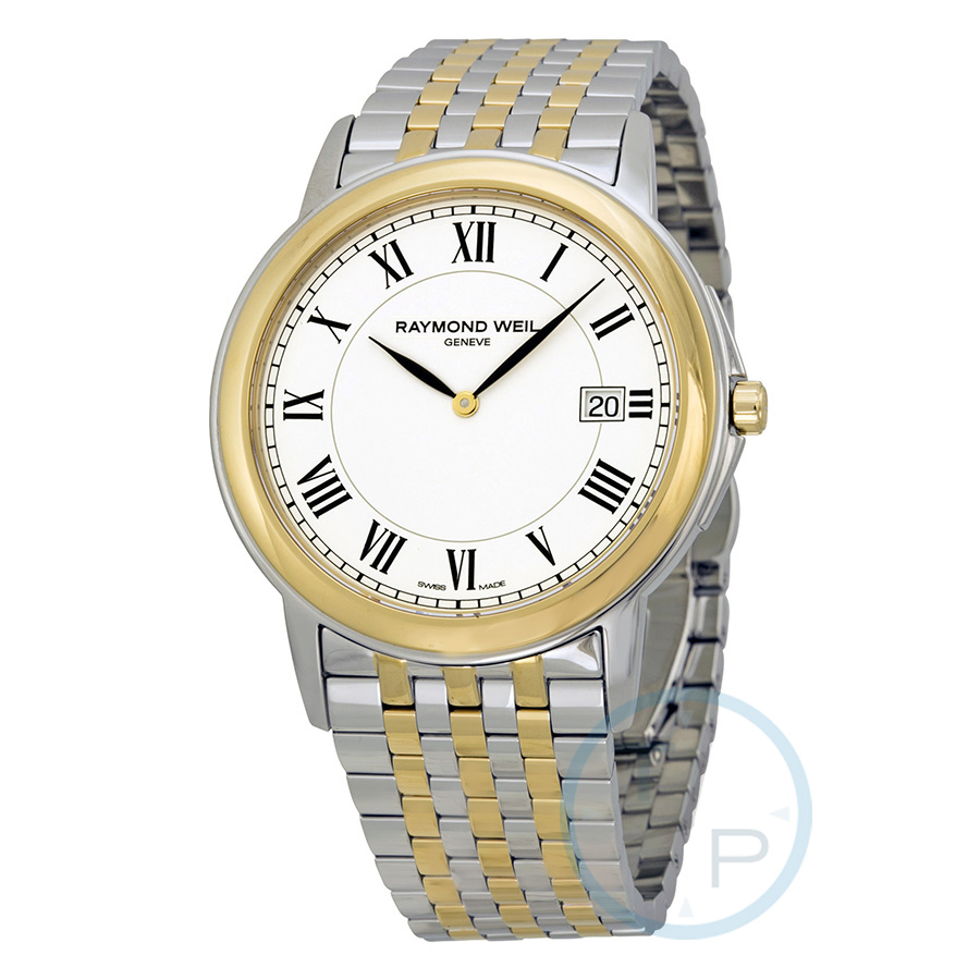 Stainless steel case with a two-tone (silver and yellow gold PVD) stainless steel bracelet. Fixed yellow gold PVD bezel. White dial with black hands and Roman numeral hour markers. Minute markers around the outer rim. Dial Type: Analog. Date display at the 3 o'clock position. Quartz movement. Scratch resistant sapphire crystal. Pull / push crown. Solid case back. Case diameter: 39 mm. Case thickness: 6 mm. Round case shape. Band width: 18 mm. Band length: 7.75 inches. Hidden folding clasp. Water resistant at 50 meters / 165 feet. Raymond Weil Tradition White Dial Two-tone Mens Watch 5466-STP-00300.