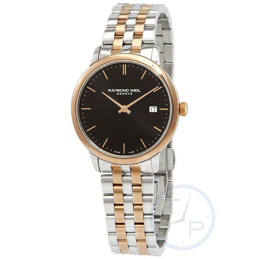 Stainless steel case with a two-tone (stainless steel with rose gold PVD plated) stainless steel bracelet. Fixed rose gold PVD bezel. Black dial with rose gold-tone hands and index hour markers. Minute markers around the outer rim. Dial Type: Analog. Date display at the 3 o'clock position. Quartz movement. Scratch resistant sapphire crystal. Pull / push crown. Solid case back. Round case shape. Case size: 39 mm. Case thickness: 7.82 mm. Fold over clasp with a safety release. Water resistant at 50 meters / 165 feet. Functions: date, hour, minute. Dress watch style. Watch label: Swiss Made. Raymond Weil Toccata Classic Quartz Black Dial Mens Watch 5485-SP5-20001.