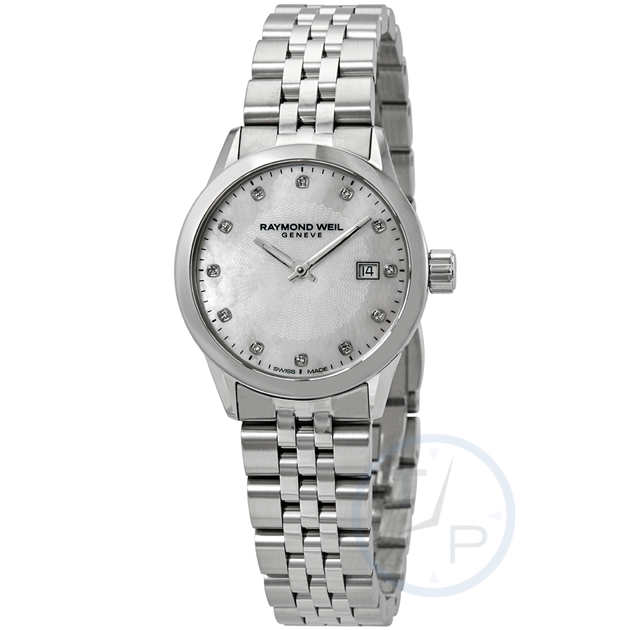 Stainless steel case with a stainless steel bracelet. Fixed stainless steel bezel. White mother of pearl dial with silver-tone hands and diamond hour markers. Minute markers around the outer rim. Dial Type: Analog. Quartz movement. Scratch resistant sapphire crystal. Screw down crown. Solid case back. Round case shape. Case size: 29 mm. Case thickness: 7.65 mm. Band width: 16 mm. Fold over clasp with a push button release. Water resistant at 100 meters / 330 feet. Functions: date, hour, minute. Freelancer Series. Dress watch style. Watch label: Swiss Made. Raymond Weil Freelancer Quartz Diamond White Mother of Pearl Dial Ladies Watch 5629-ST-97081.