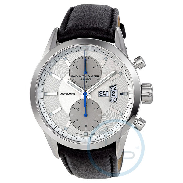 Stainless steel case with a black leather strap. Fixed bezel. Silver dial with silver-tone hands and stick hour markers. Minute markers around the outer rim. Dial Type: Analog. Luminescent hands and markers. Day and date display appears at the 3 o'clock position. Two sub-dials displaying: 30 minute and 12 hour. Automatic movement. Scratch resistant sapphire crystal. Screw down crown. Solid case back. Case diameter: 42 mm. Case thickness: 13.7 mm. Round case shape. Tang clasp. Water resistant at 100 meters / 330 feet. Functions: date, day, hour, minute, second. Luxury watch style. Watch label: Swiss Made.