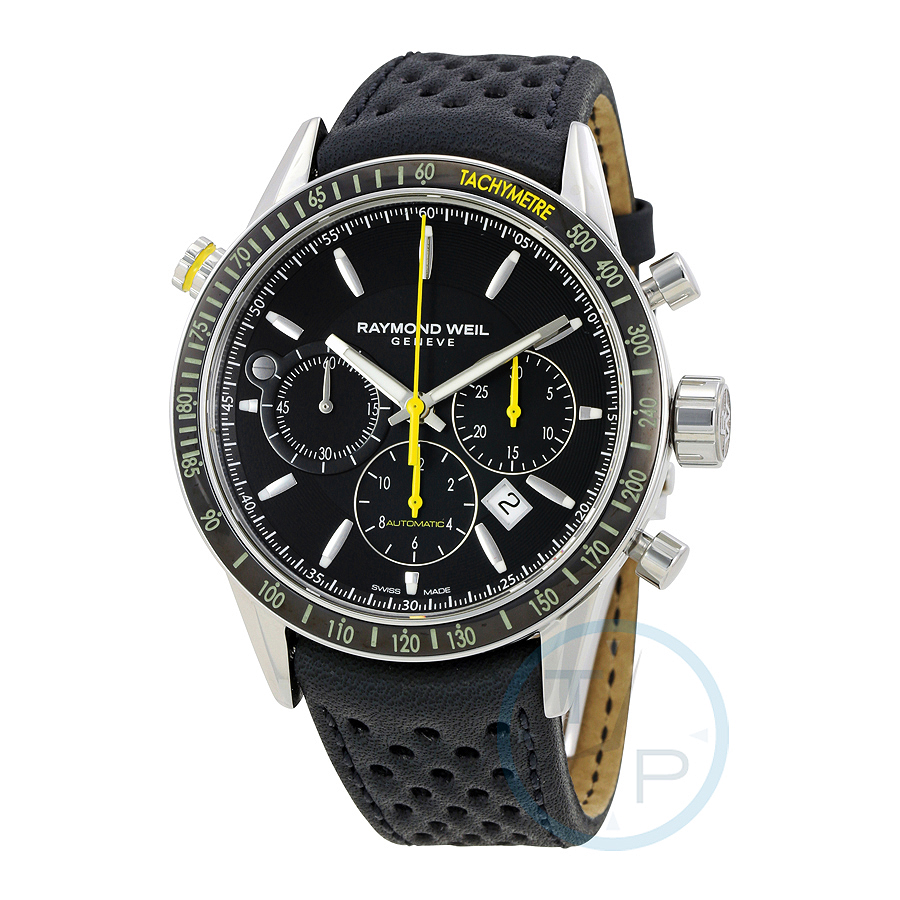 Stainless steel case with a black leather strap. Fixed stainless steel bezel with a black PVD top ring showing tachymeter markings. Black dial with luminous silver-tone hands and index hour markers. Minute markers around the outer rim. Dial Type: Analog. Luminescent hands and markers. Date display between the 4 and 5 o'clock positions. Chronograph - three sub-dials displaying: 60 second, 30 minute and 12 hours. Automatic movement. Scratch resistant sapphire crystal. Screw down crown. Transparent case back. Case size: 43.5 mm. Case thickness: 13.7 mm. Round case shape. Fold over clasp with a double push button release. Water resistant at 100 meters / 330 feet. Functions: chronograph, tachymeter, date, hour, minute, second. Luxury watch style. Watch label: Swiss Made. Raymond Weil Freelancer Chronograph Automatic Mens Watch 7740-SC1-20021.