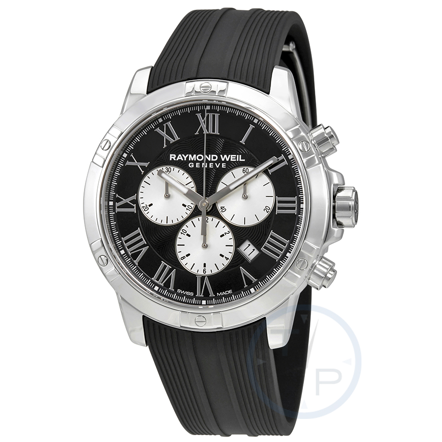 Stainless steel case with a black rubber strap. Fixed stainless steel bezel. Black dial with luminous silver-tone hands and Roman numeral hour markers. Minute markers around the outer rim. Dial Type: Analog. Luminescent hands. Date display between the 4 and 5 o'clock positions. Chronograph - three silver sub-dials displaying: 60 second, 30 minute and 12 hours. Quartz movement. Scratch resistant sapphire crystal. Screw down crown. Solid case back. Case size: 43 mm. Case thickness: 11.9 mm. Round case shape. Band width: 20 mm. Deployment clasp with a push button release. Water resistant at 300 meters / 1000 feet. Functions: chronograph, date, hour, minute, second. Dress watch style. Watch label: Swiss Made. Raymond Weil Tango Chronograph Black Dial Mens Watch 8560-SR-00206.