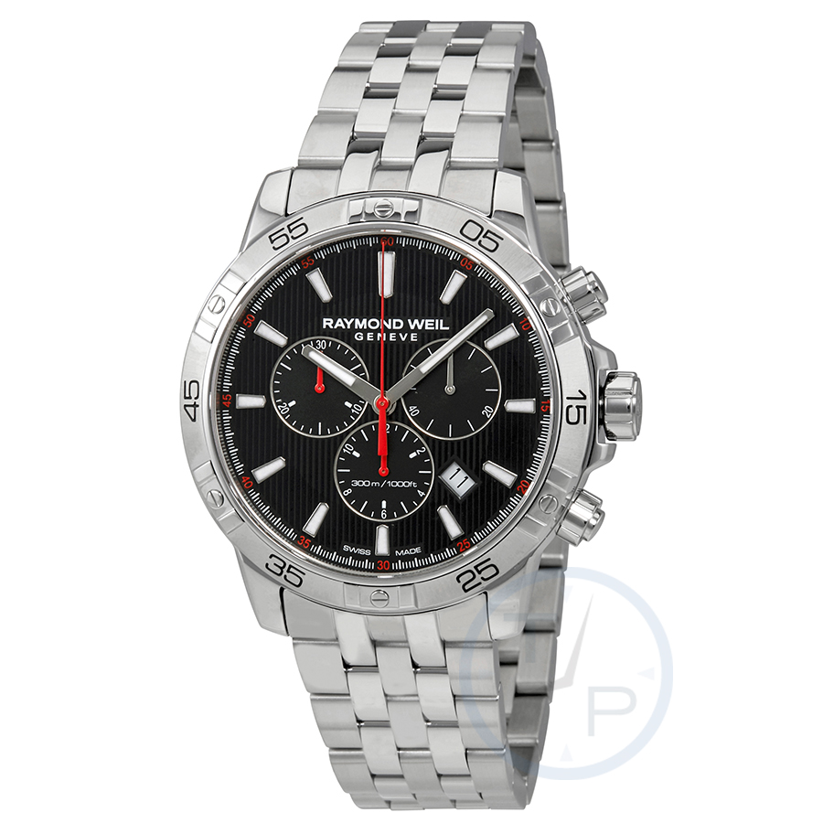 Stainless steel case with a stainless steel bracelet. Uni-directional rotating stainless steel bezel. Black dial with luminous silver-tone hands and index hour markers. Minute markers around the outer rim. Dial Type: Analog. Luminescent hands and markers. Date display between the 4 and 5 o'clock positions. Chronograph - three sub-dials displaying: 60 second, 30 minute and 12 hours. Quartz movement. Scratch resistant sapphire crystal. Screw down crown. Solid case back. Case size: 43 mm. Case thickness: 11.9 mm. Round case shape. Band width: 18 mm. Deployment clasp with a push button release. Water resistant at 300 meters / 1000 feet. Functions: chronograph, date, hour, minute, second. Dress watch style. Watch label: Swiss Made. Raymond Weil Tango Chronograph Black Dial Mens Watch 8560-ST2-20001