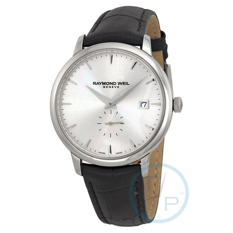 Stainless steel case with a black leather strap. Fixed stainless steel bezel. Silver dial with silver-tone hands and index hour markers. Minute markers around the outer rim. Dial Type: Analog. Date display at the 3 o'clock position. Seconds sub-dial above the 6 o'clock position. Quartz movement. Scratch resistant sapphire crystal. Pull / push crown. Solid case back. Case diameter: 39 mm. Case thickness: 8 mm. Round case shape. Band width: 19 mm. Band length: 7.75 inches. Tang clasp. Water resistant at 50 meters / 165 feet. Functions: date, hour, minute, second. Casual watch style. Raymond Weil Toccata Silver Dial Black Leather Mens Watch RW-5484-STC-65001.