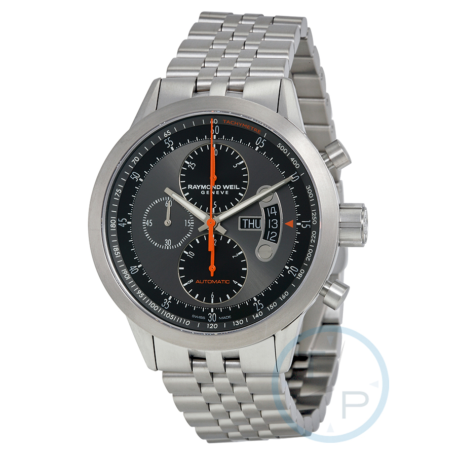 Titanium case with a titanium bracelet. Fixed titanium bezel. Grey and black dial with luminous silver-tone hands and index hour markers. Minute markers. Tachymeter around the outer rim. Dial Type: Analog. Day of the Week and Date display at the 3 o'clock position. Chronograph - three sub-dials displaying: 60 second, 30 minute and 12 hour. Automatic movement with a 46-hour power reserve. Scratch resistant sapphire crystal. Pull / push crown. Skeleton case back. Case diameter: 45 mm. Case thickness: 13.7 mm. Round case shape. Fold over clasp. Water resistant at 100 meters / 330 feet. Dress watch style. Raymond Weil Freelancer Grey and Black Dial Titanium Mens Watch 7745-TI-05609.