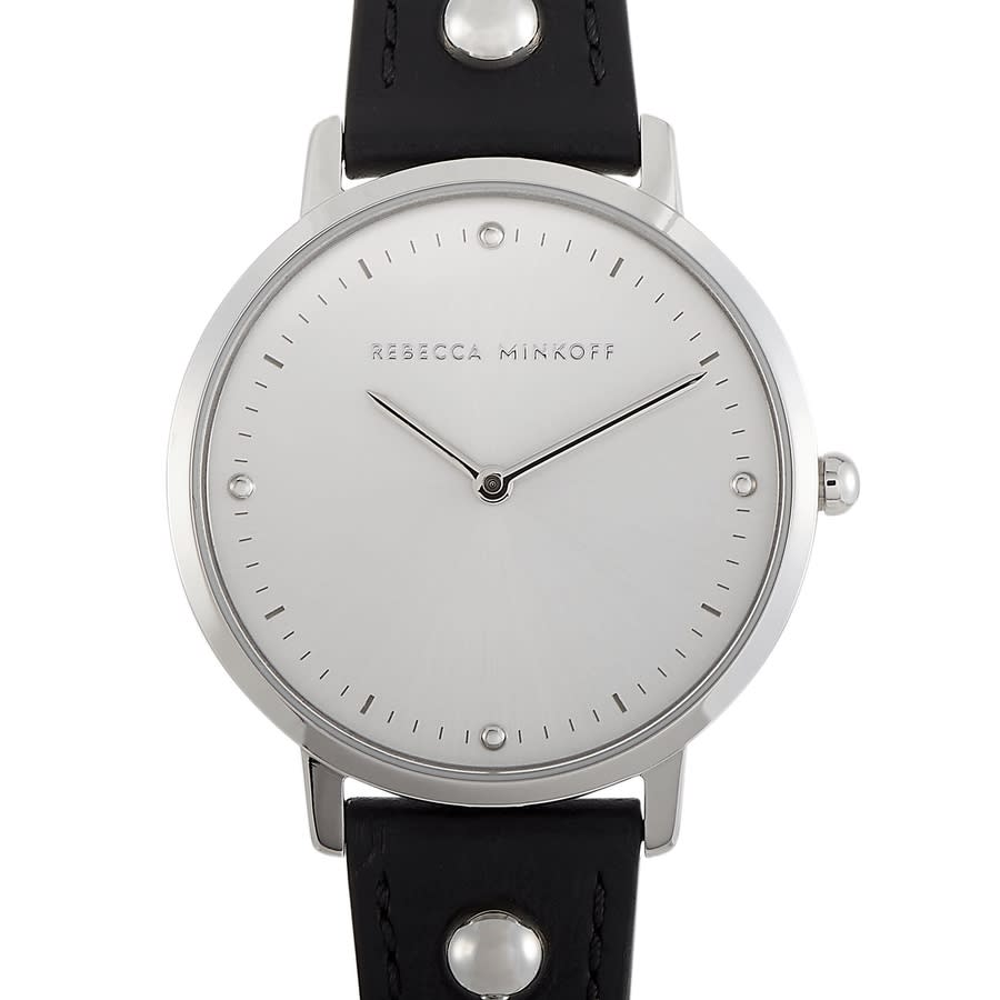 Stainless steel case with a black leather strap. Fixed stainless steel bezel. Silver white dial with silver-tone hands and index hour markers. Minute markers around the outer rim. Dial Type: Analog. Quartz movement. Scratch resistant mineral crystal. Pull / push crown. Solid case back. Round case shape. Case size: 35 mm. Case thickness: 6.2 mm. Band width: 16 mm. Tang clasp. Water resistant at 30 meters / 100 feet. Functions: hour, minute,. Major Series. Luxury watch style. Rebecca Minkoff Major Quartz Silver White Dial Ladies Watch 2200320.