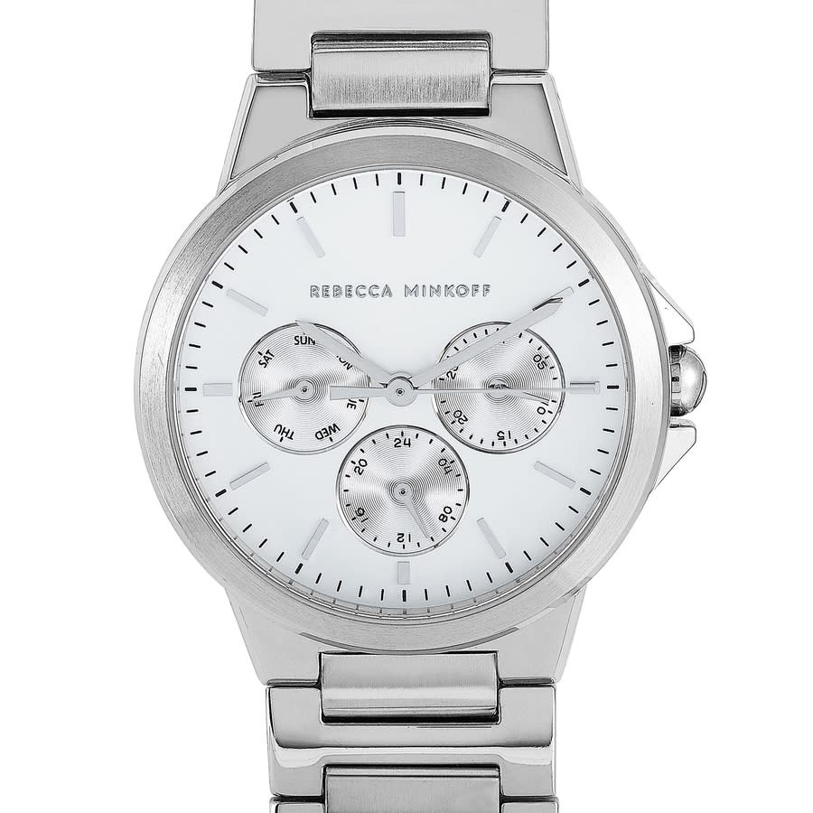 Stainless steel case with a stainless steel bracelet. Fixed stainless steel bezel. Silver white dial with silver-tone hands and index hour markers. Minute markers around the outer rim. Dial Type: Analog. Three multi-function sub-dials displaying: 24 hours, date and day of the week. Quartz movement. Scratch resistant mineral crystal. Pull / push crown. Solid case back. Round case shape. Case size: 36 mm. Case thickness: 8.6 mm. Band width: 20 mm. Fold over clasp with a push button release. Water resistant at 30 meters / 100 feet. Functions: date, day, hour, minute, second. Cali Series. Casual watch style. Rebecca Minkoff Cali Quartz Silver White Dial Ladies Watch 2200356.