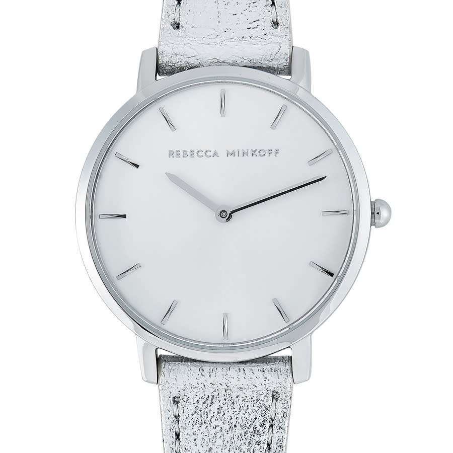 Stainless steel case with a silver (metallic) leather strap. Fixed stainless steel bezel. Silver white dial with silver-tone hands and index hour markers. Dial Type: Analog. Quartz movement. Scratch resistant mineral crystal. Pull / push crown. Solid case back. Round case shape. Case size: 35 mm. Case thickness: 6.2 mm. Band width: 16 mm. Tang clasp. Water resistant at 30 meters / 100 feet. Functions: hour, minute. Major Series. Casual watch style. Rebecca Minkoff Major Quartz Silver White Dial Ladies Watch 2200365.