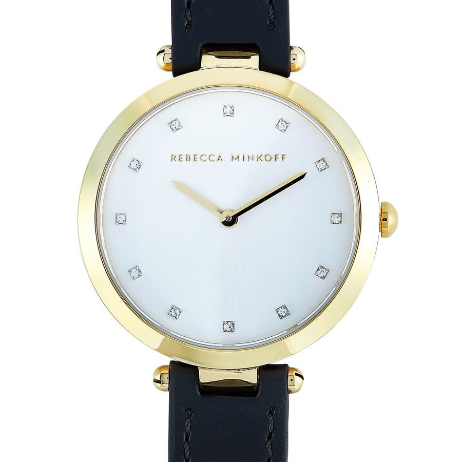 Gold-plated stainless steel case with a black leather strap. Fixed gold-plated bezel. Silver dial with gold-tone hands. Dial Type: Analog. Quartz movement. Scratch resistant mineral crystal. Pull / push crown. Solid case back. Round case shape. Case size: 33 mm. Case thickness: 6.9 mm. Band width: 13 mm. Tang clasp. Water resistant at 30 meters / 100 feet. Functions: hour, minute. Nina Series. Casual watch style. Rebecca Minkoff Nina Quartz Silver Dial Ladies Watch 2200401.