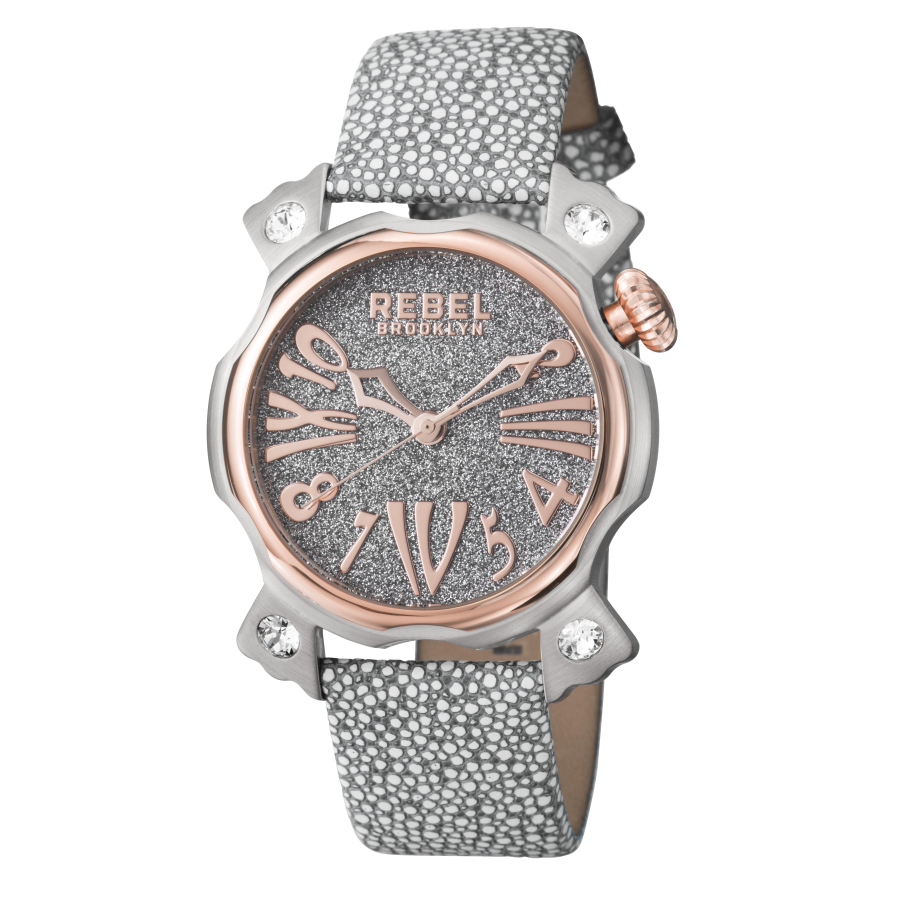 Silver-tone stainless steel case with a blue leather strap. Fixed silver-tone stainless steel bezel. Silver dial with gold-tone hands and Roman and Arabic numeral hour markers. Dial Type: Analog. Quartz movement. Scratch resistant mineral crystal crystal. Push/pull crown. Solid case back. Round case shape, case size: 44 mm, case thickness: 11 mm. Band width: 22 mm, band length: 7.5 inches. Buckle clasp. Water resistant at 50 meters / 165 feet. Functions: hour, minute, second. Casual watch style. Rebel Coney Island Quartz Silver Dial Mens Watch RB104-5011.