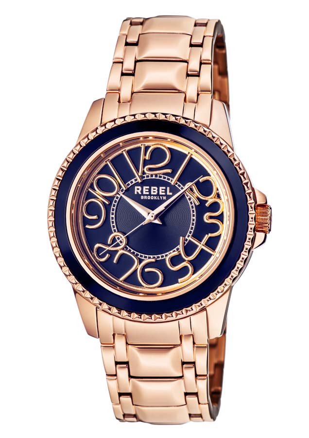 Rose gold-tone stainless steel case with a rose stainless steel bracelet. Fixed rose gold-tone stainless steel bezel. Blue dial with rose gold-tone hands and Arabic numeral hour markers. Dial Type: Analog. Quartz movement. Scratch resistant mineral w/ sapphire coating crystal. Push/pull crown. Solid case back. Round case shape, case size: 42 mm, case thickness: 11 mm. Band width: 22 mm, band length: 8.5 inches. Deployment clasp. Water resistant at 50 meters / 165 feet. Functions: hour, minute, second. Casual watch style. Rebel Williamsburg Blue Dial Mens Watch RB107-8049.