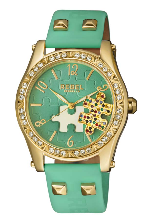 Gold-tone stainless steel case with a teal leather strap. Fixed gold-tone stainless steel bezel. Teal dial with gold-tone hands and Arabic numeral and index hour markers. Dial Type: Analog. Quartz movement. Scratch resistant mineral w/ sapphire coating crystal. Push/pull crown. Solid case back. Round case shape, case size: 40 mm, case thickness: 12 mm. Band width: 20 mm, band length: 7.5 inches. Tang clasp. Water resistant at 50 meters / 165 feet. Functions: hour, minute, second. Casual watch style. Rebel Gravesend Ladies Watch RB111-9121.