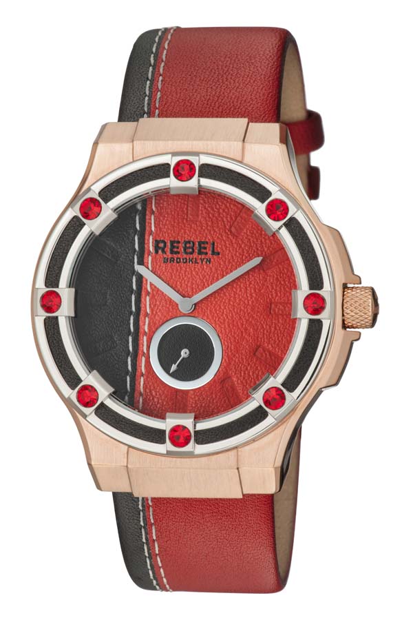 Two-tone stainless steel case with a black and burgundy leather strap. Fixed stainless steel bezel. Black and burgundy dial with silver-tone hands and index hour markers. Dial Type: Analog. One - 60 seconds subdial. Quartz movement. Scratch resistant mineral crystal. Push/pull crown. Solid case back. Round case shape, case size: 44 mm, case thickness: 11 mm. Band width: 23 mm, band length: 7.5 inches. Tang clasp. Water resistant at 50 meters / 165 feet. Functions: hour, minute, second. Casual watch style. Rebel Flatbush Ladies Watch RB119-5181.