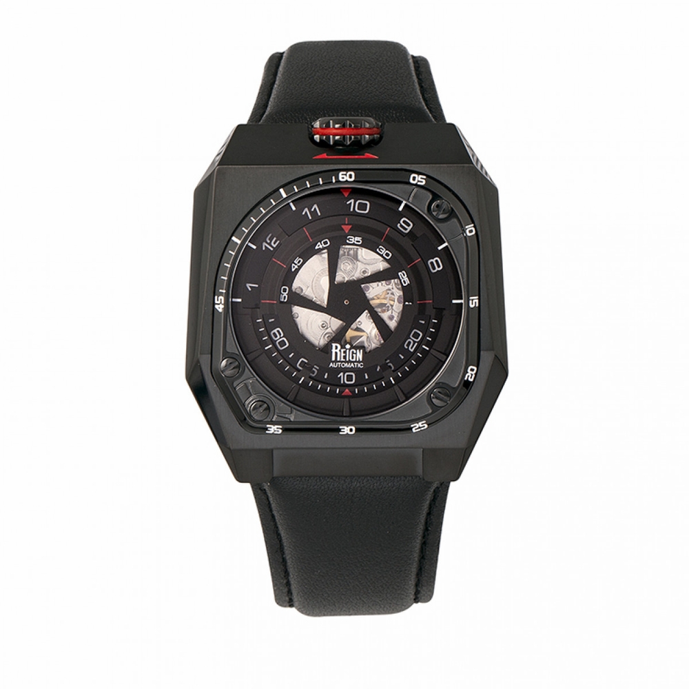 Black-plated stainless steel case with a black leather strap. Fixed black-plated bezel. Black (skeleton) dial with (rotating) Arabic numeral hour markers. (Rotating) minute markers (at 5 minute intervals). Dial Type: Analog. Automatic movement. Scratch resistant sapphire crystal. Pull / push crown. Solid case back. Square case shape. Case size: 47 mm. Case thickness: 16 mm. Band width: 27 mm. Tang clasp. Water resistant at 100 meters / 330 feet. Functions: hour, minute, second. Asher Series. Dress watch style. Item Variations: REIRN5102. Reign Asher Automatic Black Dial Mens Watch REIRN5102.