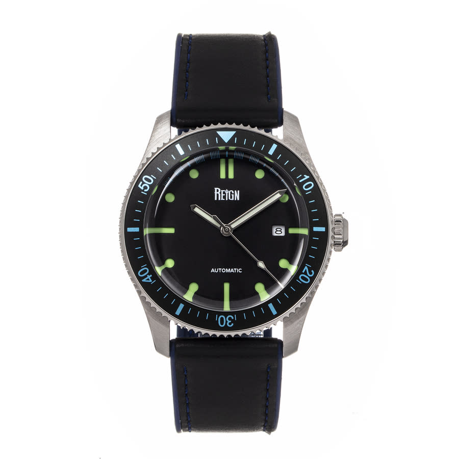 Band Color: Black Rubber Inlaid Leather; Band Width: 22mm near case; 20mm near clasp/buckle; Bezel Color: Black; Case: Silver + Circle-Shaped; Case Finish: Polished + Stainless Steel; Case Thickness: 15mm; Case Width: 42mm; 45mm with Crown; Clasp / Buckle: Strap Buckle; Dial: Black + Analog; Hand Color: Silver; Movement: Japanese + Automatic; Time Zones: Single; Water Resistance: 10 ATM.