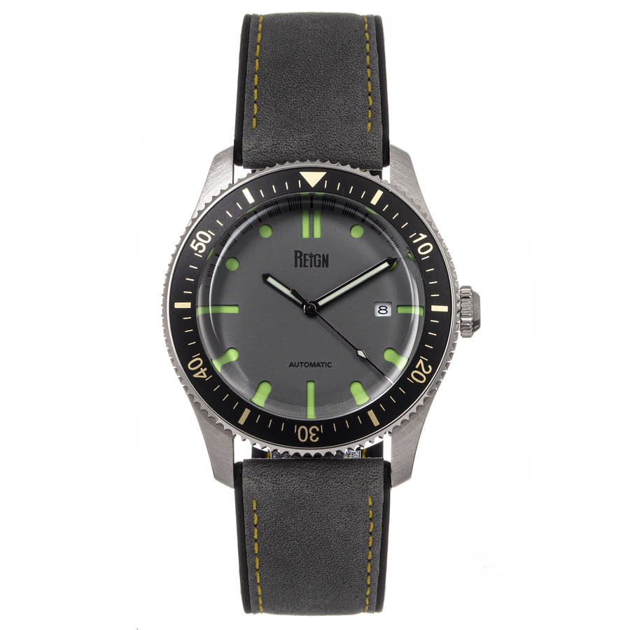 Band Color: Grey Rubber Inlaid Leather; Band Width: 22mm near case; 20mm near clasp/buckle; Bezel Color: Black; Case: Silver + Circle-Shaped; Case Finish: Polished + Stainless Steel; Case Thickness: 15mm; Case Width: 42mm; 45mm with Crown; Clasp / Buckle: Strap Buckle; Dial: Grey + Analog; Hand Color: Silver; Movement: Japanese + Automatic; Time Zones: Single; Water Resistance: 10 ATM.
