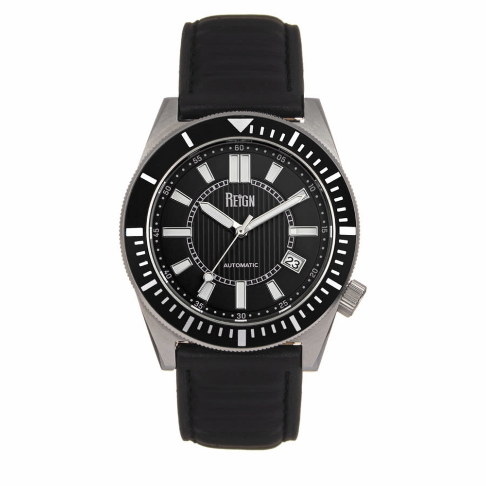 Band Color: Black Genuine Leather; Band Width: 22mm near case; 20mm near clasp/buckle; Bezel Color: Black; Case: Silver + Circle-Shaped; Case Finish: Brushed + Stainless Steel; Case Thickness: 14mm; Case Width: 42mm; 45mm with Crown; Clasp / Buckle: Strap Buckle; Dial: Black + Analog; Hand Color: Silver; Movement: Japanese + Automatic; Time Zones: Single; Water Resistance: 10 ATM.