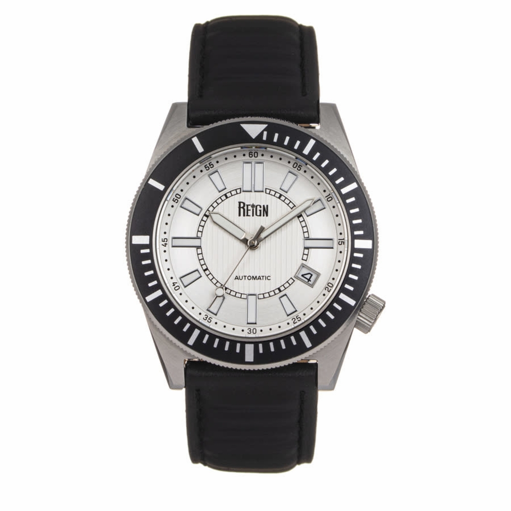 Band Color: Black Genuine Leather; Band Width: 22mm near case; 20mm near clasp/buckle; Bezel Color: Black; Case: Silver + Circle-Shaped; Case Finish: Brushed + Stainless Steel; Case Thickness: 14mm; Case Width: 42mm; 45mm with Crown; Clasp / Buckle: Strap Buckle; Dial: Silver + Analog; Hand Color: Silver; Movement: Japanese + Automatic; Time Zones: Single; Water Resistance: 10 ATM.