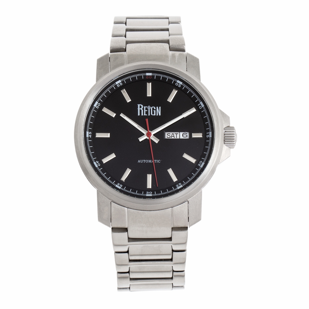 Silver-tone stainless steel case with a silver-tone stainless steel bracelet. Fixed silver-tone stainless steel bezel. Black dial with silver-tone hands and index hour markers. Minute markers around the outer rim. Dial Type: Analog. Luminescent hands and markers. Day of the week and date display at the 3 o'clock position. Miyota Caliber 8205 automatic movement with a 42-hour power reserve. Scratch resistant mineral crystal. Pull / push crown. Transparent case back. Round case shape, case size: 43 mm, case thickness: 13 mm. Band width: 22 mm. Fold over push button deployment clasp. Water resistant at 100 meters / 330 feet. Functions: date, day, hour, minute, second. Casual watch style. Watch label: Japan Movt. Item Variations: REIRN5702. Reign Helios Automatic Black Dial Mens Watch REIRN5702.