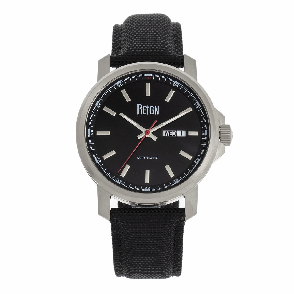 Silver-tone stainless steel case with a black stainless steel bracelet. Fixed silver-tone stainless steel bezel. Black dial with index hour markers. Minute markers around the outer rim. Dial Type: Analog. Luminescent hands and markers. Day of the week and date display at the 3 o'clock position. Miyota Caliber 8205 automatic movement with a 42-hour power reserve. Scratch resistant mineral crystal. Pull / push crown. Transparent case back. Round case shape, case size: 43 mm, case thickness: 13 mm. Band width: 22 mm. Fold over push button deployment clasp. Water resistant at 100 meters / 330 feet. Functions: date, day, hour, minute, second. Casual watch style. Watch label: Japan Movt. Item Variations: REIRN5705. Reign Helios Automatic Black Dial Mens Watch REIRN5705.