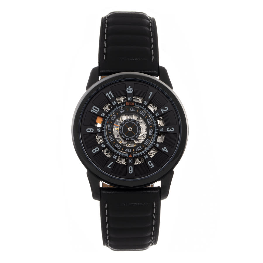 Black stainless steel case with a black genuine leather strap. Fixed black stainless steel bezel. Black dial with orange hands and Arabic numeral hour markers. Minute scale around the inner rim. Dial Type: Analog. Automatic movement. Scratch resistant mineral crystal. Pull / push crown. Transparent case back. Round case shape, case size: 42 mm, case thickness: 14 mm. Band width: 22 mm, band length: 8.5 inches. Buckle clasp. Water resistant at 100 meters / 330 feet. Functions: hour, minute, second. Monterey Series. Casual watch style. Reign Monterey Automatic Black Dial Mens Watch REIRN6404.