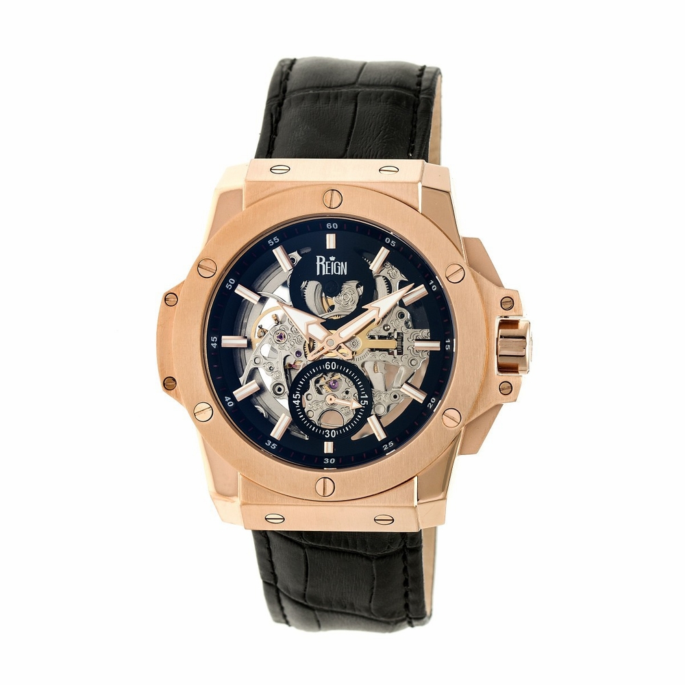 Rose gold-tone stainless steel case with a black leather strap. Fixed rose gold-tone stainless steel bezel. Black dial with gold-tone hands and index hour markers. Dial Type: Analog. Luminescent hands and markers. Automatic movement. Scratch resistant mineral crystal. Pull / push crown. Transparent case back. Tonneau case shape, case size: 48 mm, case thickness: 13 mm. Band width: 24 mm. Buckle clasp. Water resistant at 50 meters / 165 feet. Functions: hour, minute, small second. Dress watch style. Item Variations: REIRN4005. Reign Commodus Automatic Black Dial Mens Watch REIRN4005.