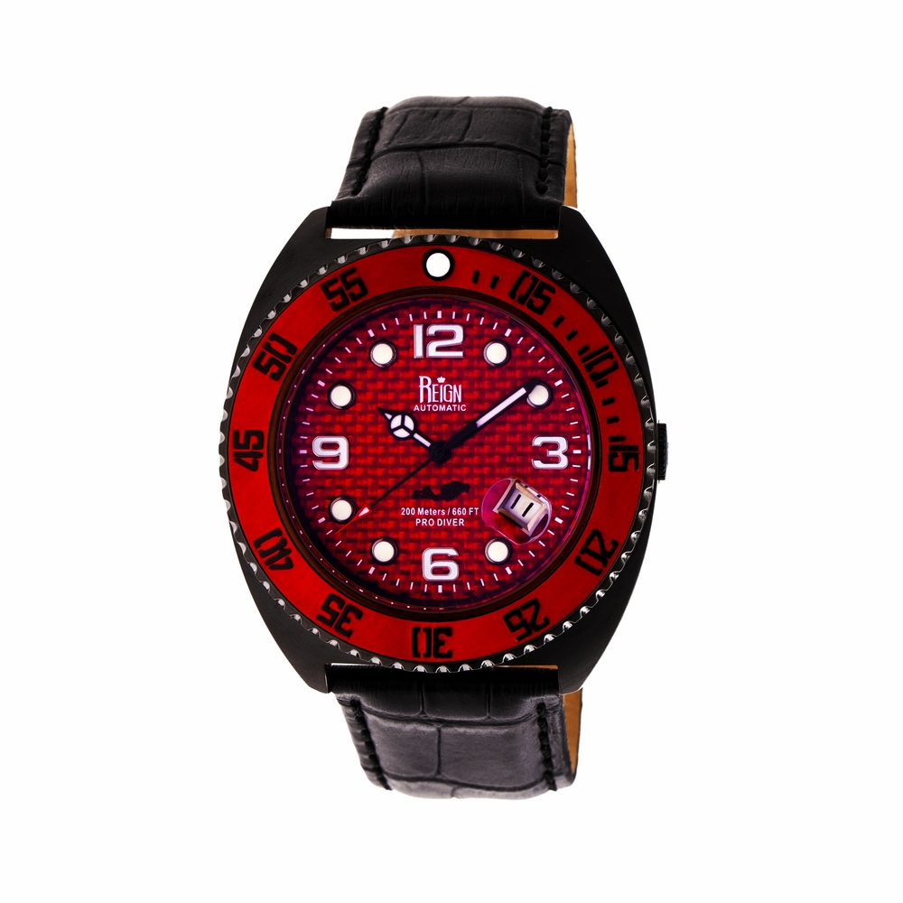 Black stainless steel case with a black leather strap. Uni-directional rotating red bezel. Red dial with black Mercedes-logo, sword, and Breguet-style shape hands and Arabic numeral and index hour markers. Minute markers around the outer rim. Dial Type: Analog. Luminescent hands and markers. Date display at the 4 o'clock position. Automatic movement with a 42-hour power reserve. Scratch resistant mineral crystal. Transparent case back. Cushion case shape, case size: 45 mm, case thickness: 18 mm. Band width: 24 mm. Buckle clasp. Water resistant at 200 meters / 660 feet. Functions: date, hour, minute, second. Dive watch style. Item Variations: REIRN4907. Reign Quentin Automatic Red Dial Mens Watch REIRN4907.