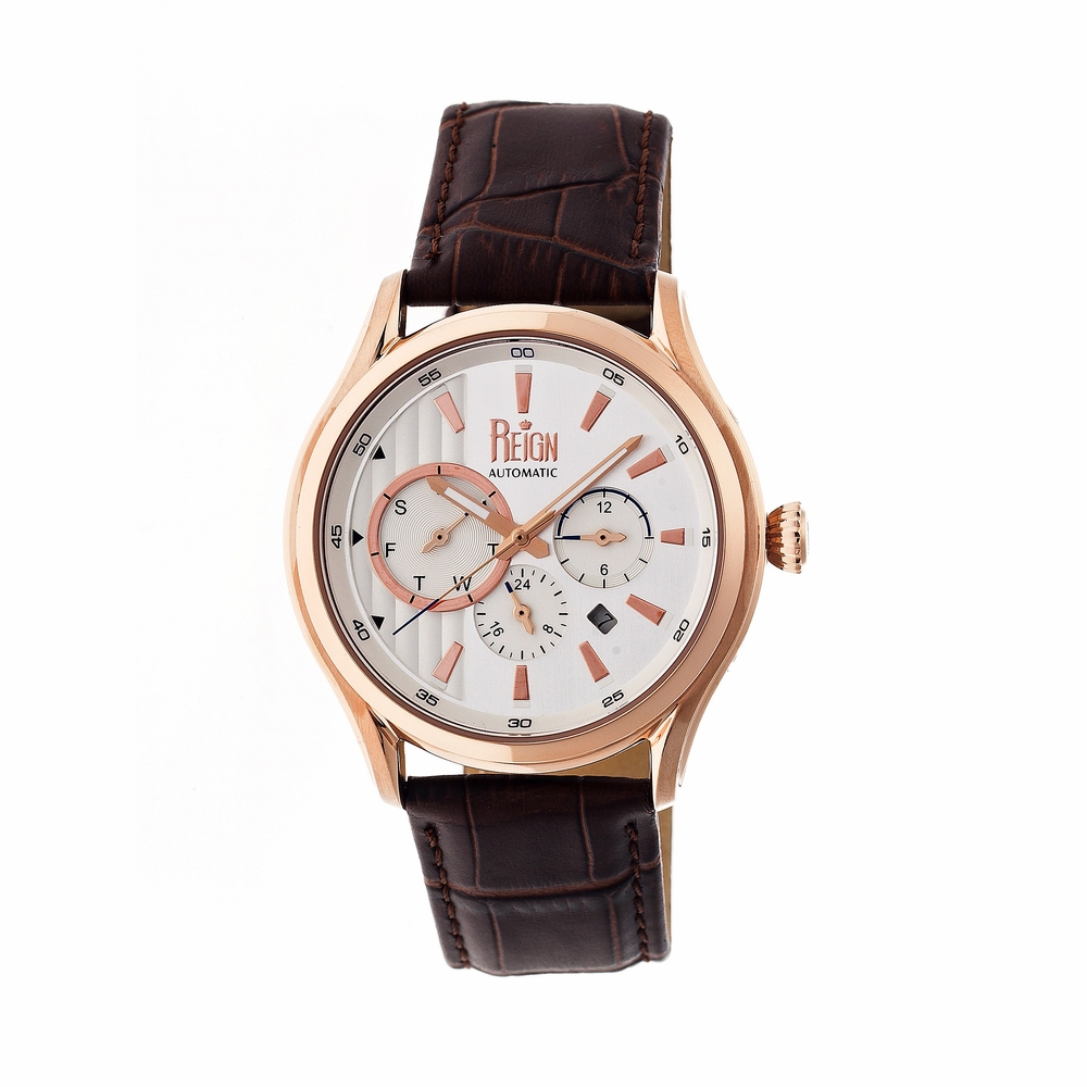 Rose gold-tone stainless steel case with a brown leather strap. Fixed rose gold-tone bezel. Beige engraved dial with luminous rose gold-tone hands and index hour markers. Minute markers around the outer rim. Dial Type: Analog. Luminescent hands and markers. Date display between 4 and 5 o'clock positions. Three multi-function sub-dials displaying: day of the week, month, and 24 hour. Automatic movement with a 36-hour power reserve. Scratch resistant sapphire-coated mineral crystal. Pull / push crown. Skeleton case back. Case diameter: 43 mm. Case thickness: 14 mm. Round case shape. Band width: 22 mm. Tang clasp. Water resistant at 100 meters / 330 feet. Functions: date, day, month, hour, minute, second. Additional Info: average gain/loss rate: +/- 45 seconds per day. Dress watch style. Reign Gustaf Beige Engraved Dial Brown Leather Strap Mens Watch RN1504.