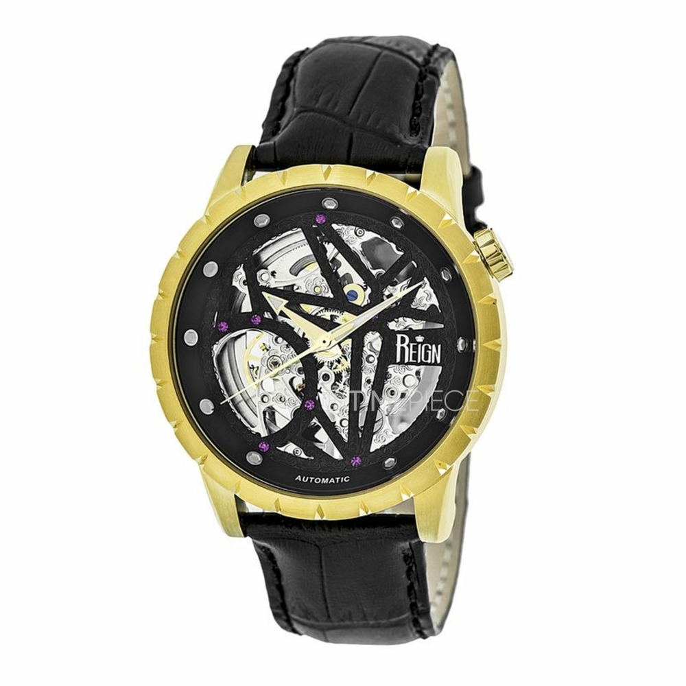 Yellow gold-tone 316l surgical stainless steel case with a black embossed leather strap. Fixed bezel. Black skeleton dial with yellow gold-tone hands and dot hour markers. Dial Type: Analog. Automatic movement with about 42 hours of power reserve. Scratch resistant sapphire-coated mineral crystal. Transparent case back. Case size: 43 mm. Round case shape. Tang clasp. Water resistant at 50 meters / 165 feet. Functions: hour, minute, second. Casual watch style. Reign Xavier Gold-Tone Black Leather Mens Watch RN3904.