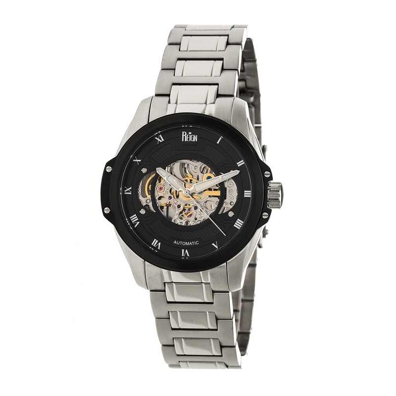 Silver-tone stainless steel case with a silver-tone stainless steel bracelet. Fixed black IP stainless steel bezel. Black skeleton dial with silver-tone hands and Roman numeral hour markers. Dial Type: Analog. Luminescent hands. Automatic movement with a 42-hour power reserve. Scratch resistant sapphire-coated mineral crystal. Skeleton transparent exhibition see through case back. Case size: 42 mm. Round case shape. Deployment with push button release clasp. Water resistant at 50 meters / 165 feet. Functions: hour, minute, second. Additional Info: average gain/loss rate: +/- 45 seconds per day. Casual watch style. Reign Constantin Black Skeleton Roman Numeral Dial Silver-tone Case Automatic Mens Watch RN4502.