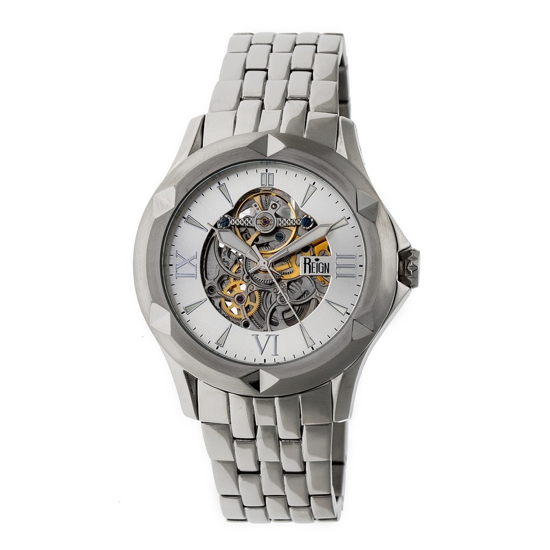 Stainless steel case with a stainless steel bracelet. Fixed stainless steel bezel. Silver skeleton dial with luminous silver-tone hands and index hour markers. Roman numerals mark the 3, 6 an 9 o'clock positions. Minute markers around the outer rim. Dial Type: Analog. Luminescent hands and markers. Automatic movement with a 36-hour power reserve. Scratch resistant sapphire-coated mineral crystal. Transparent case back. Case size: 47 mm. Case thickness: 15 mm. Round case shape. Band width: 20 mm. Deployment clasp with a push button release. Water resistant at 50 meters / 165 feet. Functions: hour, minute, second. Additional Info: average gain/loss rate: +/- 45 seconds per day. Casual watch style. Reign Dantes Automatic Silver Skeleton Dial Mens Watch RN4701.