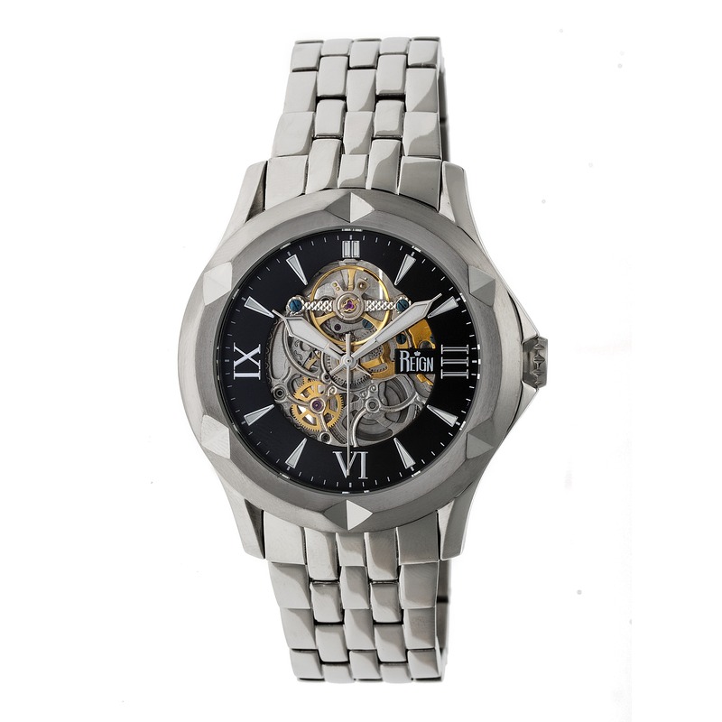 Silver-tone stainless steel case with a silver-tone stainless steel bracelet. Fixed silver-tone stainless steel bezel. Black skeleton dial with silver-tone hands and Roman numeral / index hour markers. Minute markers around the outer rim. Dial Type: Analog. Luminescent hands and markers. Automatic movement with a 36-hour power reserve. Scratch resistant sapphire-coated mineral crystal. Skeleton transparent exhibition see through case back. Case size: 47 mm. Round case shape. Deployment with push button release clasp. Water resistant at 50 meters / 165 feet. Functions: hour, minute, second. Additional Info: average gain/loss rate: +/- 45 seconds per day. Casual watch style. Reign Dantes Black Skeleton Roman Numeral Dial Silver-tone Case Automatic Mens Watch RN4702.
