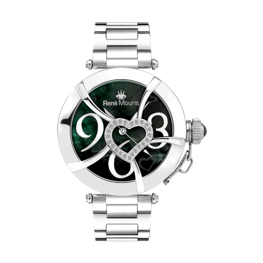 Coeur d'Amour by René Mouris is inspired by love and passion. This elegant and charming timepiece has a pink, white or black mother-of-pearl dial decorated with a motif of hearts. Premium crystals can be found edging the heart on some models, and also looping round the bezel.STAINLESS STEEL BAND & CASE - Watch case is constructed by 316L stainless steel and crafted into a 38mm diameter with 12mm thickness case. Matching with 18mm width and 200mm length 316L stainless steel band which makes it perfect fit for both casual and formal settings.SCRATCH & WATER RESISTANT - Protected by a sapphire coated mineral crystal glass that is scratch & scrape resistant and it has 5ATM certified water resistant that allows you to wear it all day long.GENUINE CRYSTAL ON BEZEL & APPLIQUE - Adorned with 23 pieces of Crystal on Heart.SHINIER MOTHER OF PEARL - Heart patterns etched onto a white mother-of-pearl the dial.Made In France.