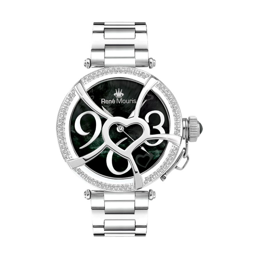 Coeur d'Amour by René Mouris is inspired by love and passion. This elegant and charming timepiece has a pink, white or black mother-of-pearl dial decorated with a motif of hearts. Premium crystals can be found edging the heart on some models, and also looping round the bezel.STAINLESS STEEL BAND & CASE - Watch case is constructed by 316L stainless steel and crafted into a 38mm diameter with 12mm thickness case. Matching with 18mm width and 200mm length 316L stainless steel band which makes it perfect fit for both casual and formal settings.SCRATCH & WATER RESISTANT - Protected by a sapphire coated mineral crystal glass that is scratch & scrape resistant and it has 5ATM certified water resistant that allows you to wear it all day long.GENUINE CRYSTAL ON BEZEL & APPLIQUE - Adorned with 107 pieces of crystals on the bezel.SHINIER MOTHER OF PEARL - Heart patterns etched onto a black mother-of-pearl the dial.Made in France