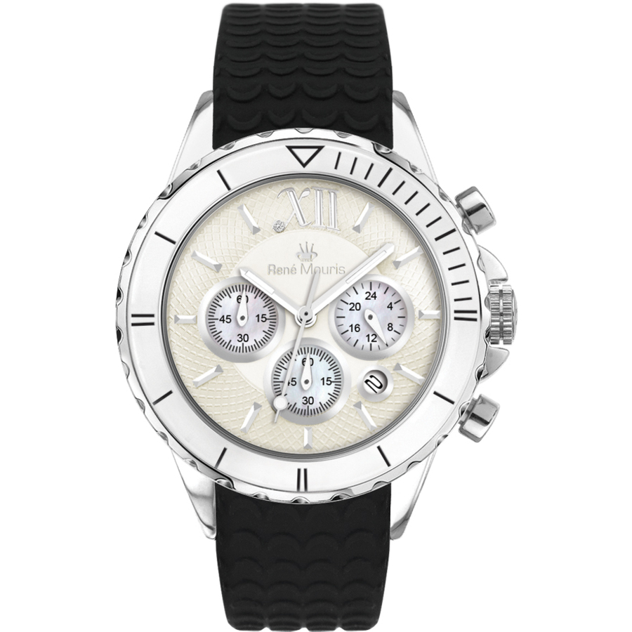 The Dream I is inspired by dream catchers, Native American inventions created to deflect bad dreams. This has been translated through a patterned dial that pays homage to the dream catchers’ strings and round mother-ofpearl sub dials. This collection has been expertly crafted from the highest-grade stainless steel and decorated the bezel with a ceramic ring. Silver-tone stainless steel case with a black silicone strap. Fixed white ceramic bezel. Two-tone dial with silver-tone hands and index hour markers. Dial Type: Analog. Luminescent hands. Between the 4 and 5 o'clock position. Chronograph - sub-dials displaying: 24 hour, 60 minute, 60 second. Quartz movement. Scratch resistant mineral crystal. Pull / push crown. Solid case back. Round case shape, case size: 38 mm, case thickness: 11 mm. Band width: 18 mm. Buckle clasp. Water resistant at 50 meters / 165 feet. Functions: chronograph, date, sport, water resistant, minute, hour, second. Additional Info: mother of pearl sub-dial. Dream I Series. Sport watch style. Watch label: French Made. Rene Mouris Dream I Chronograph Two-tone Dial Ladies Watch 50108RM1.