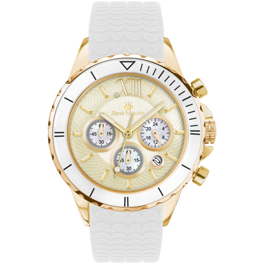 The Dream I is inspired by dream catchers, Native American inventions created to deflect bad dreams. This has been translated through a patterned dial that pays homage to the dream catchers’ strings and round mother-ofpearl sub dials. This collection has been expertly crafted from the highest-grade stainless steel and decorated the bezel with a ceramic ring. Gold-tone stainless steel case with a white silicone strap. Fixed white ceramic bezel. Two-tone dial with gold-tone hands and index hour markers. Dial Type: Analog. Luminescent hands. Between the 4 and 5 o'clock position. Chronograph - sub-dials displaying: 24 hour, 60 minute, 60 second. Quartz movement. Scratch resistant mineral crystal. Pull / push crown. Solid case back. Round case shape, case size: 38 mm, case thickness: 11 mm. Band width: 18 mm. Buckle clasp. Water resistant at 50 meters / 165 feet. Functions: chronograph, date, hour, minute, second, sport, water resistant. Additional Info: mother of pearl sub-dial. Dream I Series. Sport watch style. Watch label: French Made. Rene Mouris Dream I Chronograph Two-tone Dial Ladies Watch 50108RM6.