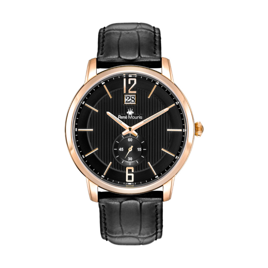 Executive collection is a classic quartz timepiece. It has a contemporary, minimalist interpretation of a timeless design. Its blend of sophistication and modernity makes it the perfect watch to wear to work and on the weekend. The dial is beautifully make it incredibly legible. Polished stainless steel, rose gold plating or black PVD cases are sure to attract compliments. Rose gold-tone stainless steel case with a black genuine leather strap. Fixed rose gold-tone stainless steel bezel. Black dial with rose gold-tone hands and Arabic numeral & index hour markers. Dial Type: Analog. Luminescent hands. Date display between 12 and 1 o'clock position. 60 second subdials. Quartz movement. Scratch resistant mineral crystal. Pull / push crown. Solid case back. Round case shape, case size: 44 mm, case thickness: 11 mm. Band width: 20 mm. Buckle clasp. Water resistant at 50 meters / 165 feet. Functions: date, hour, minute. Executive Series. Fashion watch style. Watch label: French Made. Rene Mouris Executive Black Dial Mens Watch 80101RM5.