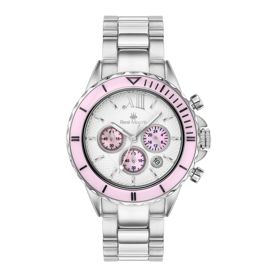 The DREAM-I is inspired by dream catchers, Native American inventions created to deflect bad dreams. This has been translated though a patterned dial that pays homage to the dream catchers’ strings and round mother-of-pearl sub dials. The watch has been expertly crafted from the highest-grade stainless steel and the bezel is decorated with a ceramic ring. The watches can be fitted with stainless steel bracelets or silicone straps. Silver-tone stainless steel case and bracelet. Fixed pink ceramic bezel. Mother of pearl dial with silver-tone hands and Roman numeral & index hour markers. Dial Type: Analog. Luminescent hands. Between the 4 and 5 o'clock position. Chronograph - three sub-dials displaying: 60 second, 60 minute and 24 hour. Quartz movement. Scratch resistant mineral crystal. Pull / push crown. Solid case back. Round case shape, case size: 38 mm, case thickness: 11 mm. Band width: 18 mm, band length: 7.5 inches. Deployment with push button release clasp. Water resistant at 50 meters / 165 feet. Functions: chronograph, date, hour, minute, second. Additional Info: 60-minute chronograph, 24 hour. Dream-i Series. Sport watch style. Rene Mouris DREAM-I Chronograph Mother of Pearl Dial Ladies Watch 50107RM3.
